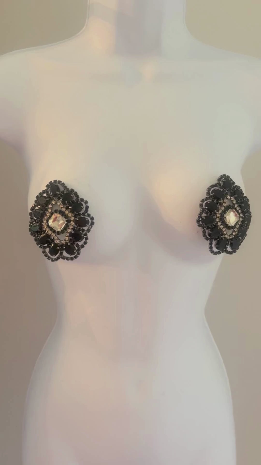 Introducing our stunning COCO CABARET pasties, meticulously handcrafted and destined for greatness. These nipple pasties are bold, beautiful, and delightfully lightweight. Lavishly adorned with striking black gems and rhinestones, they embody peek-a-boo chic.