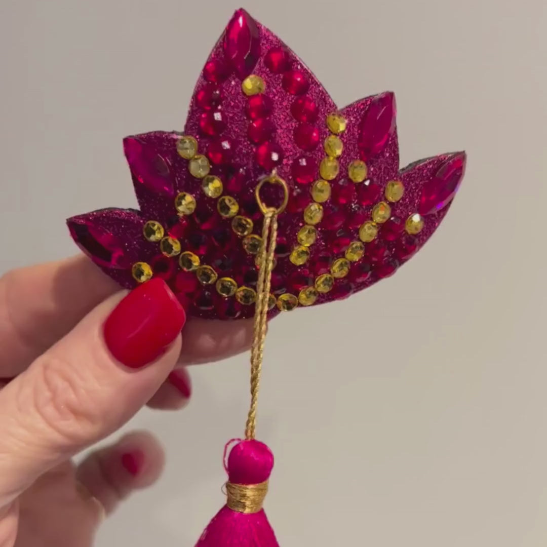 Dimensiones/Tamaño: Forma de loto: 3 " (7,6 cm) de ancho x 2" (5,1 cm) de alto hasta el pétalo más alto; con borla = 7 " (17,8 cm) de largo