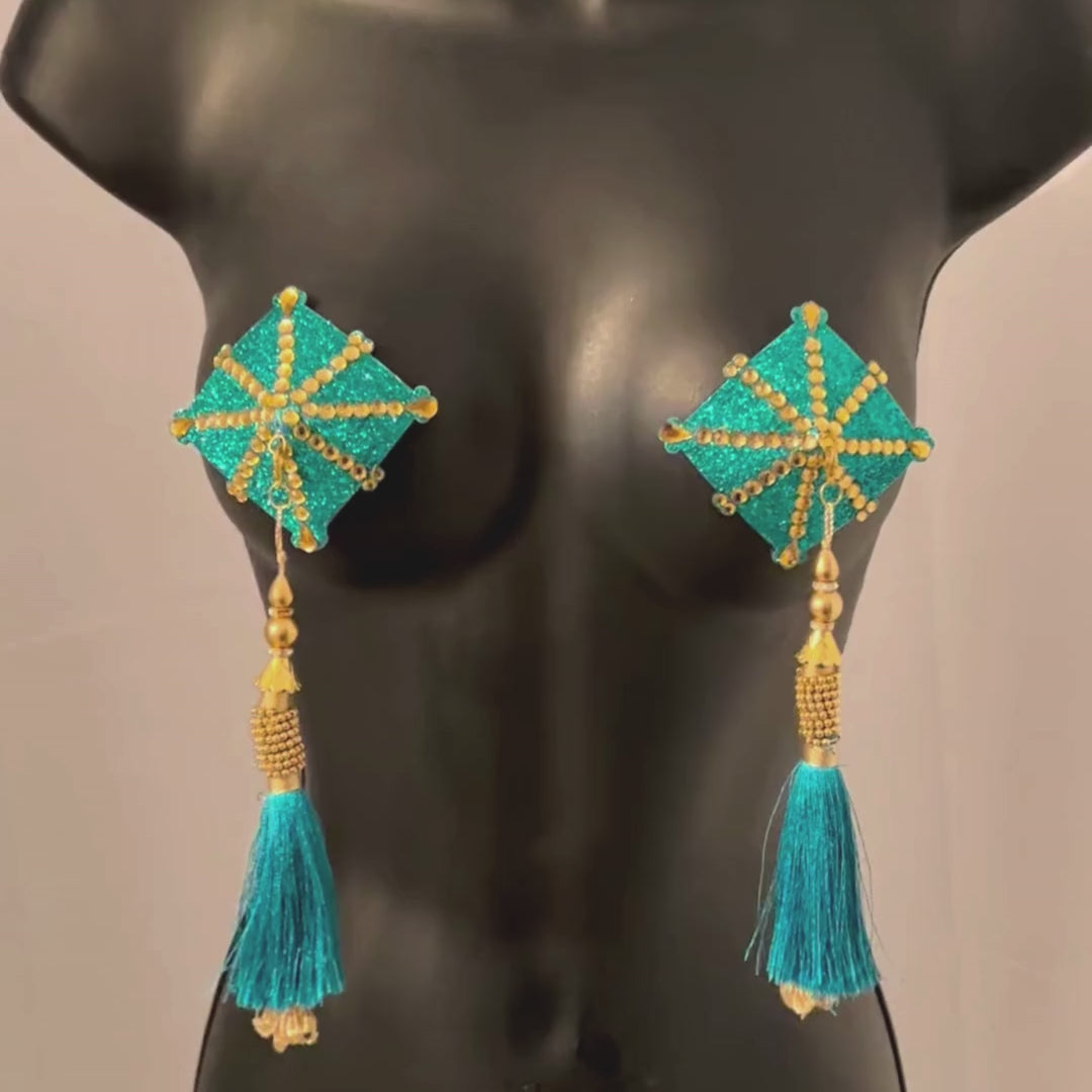 Cache-tétons CELESTE en forme de diamant bleu sarcelle et or, couvre-tétons avec pompons amovibles (2 pièces)