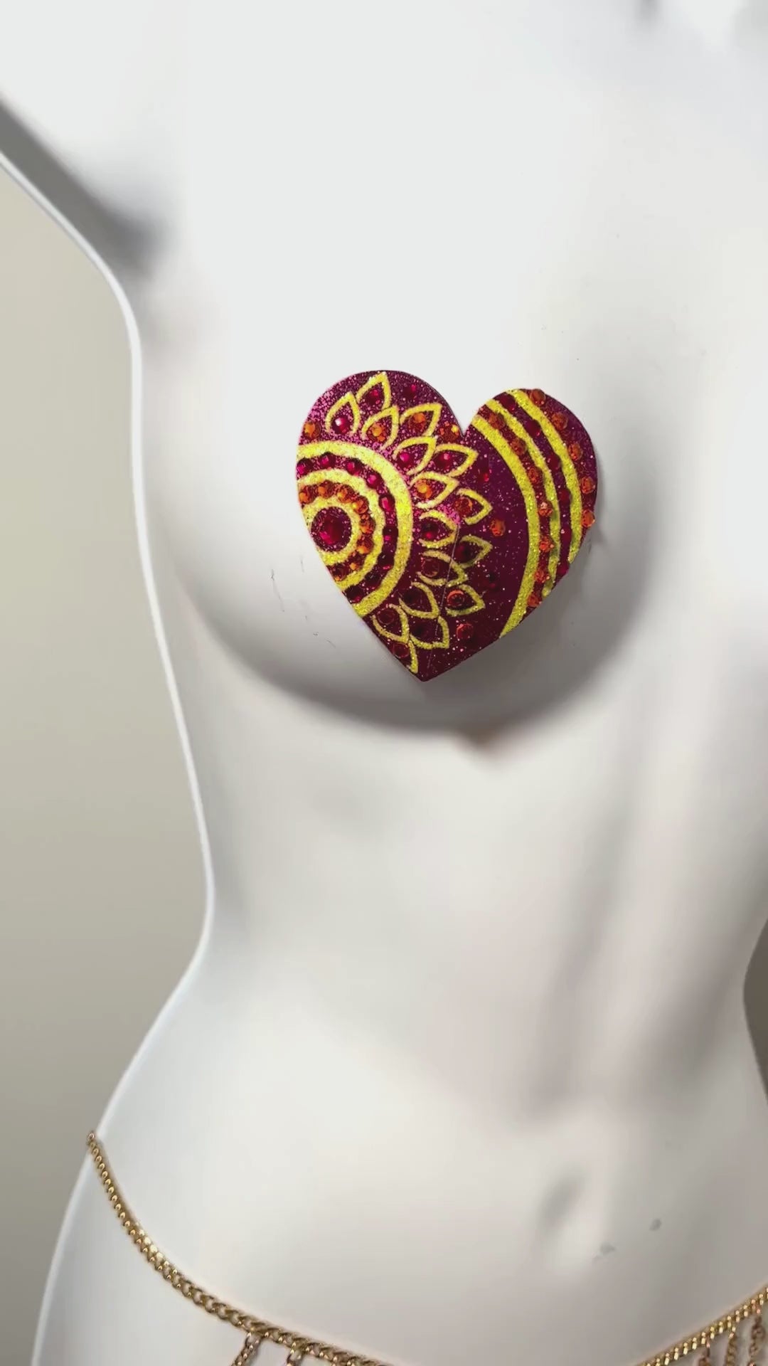 Un kaléidoscope de fabulosité ! Ces cœurs scintillants sont un peu fabergé et reine du festival. Ces cache-tétons sont incroyablement conçus en jaune et rose vif dans un design complexe semblable à une mosaïque. Magnifiques tant dans leur forme que dans leur fonction, ces pâtisseries sont conçues pour durer - ces cœurs sont parfaitement formés et fabriqués à la main avec amour. Ils ont une visière douce conçue pour mettre en valeur n'importe quelle courbe. Ils sont prêts à porter et sont autocollants : il suffit de décoller et de coller ces cache-tétons !