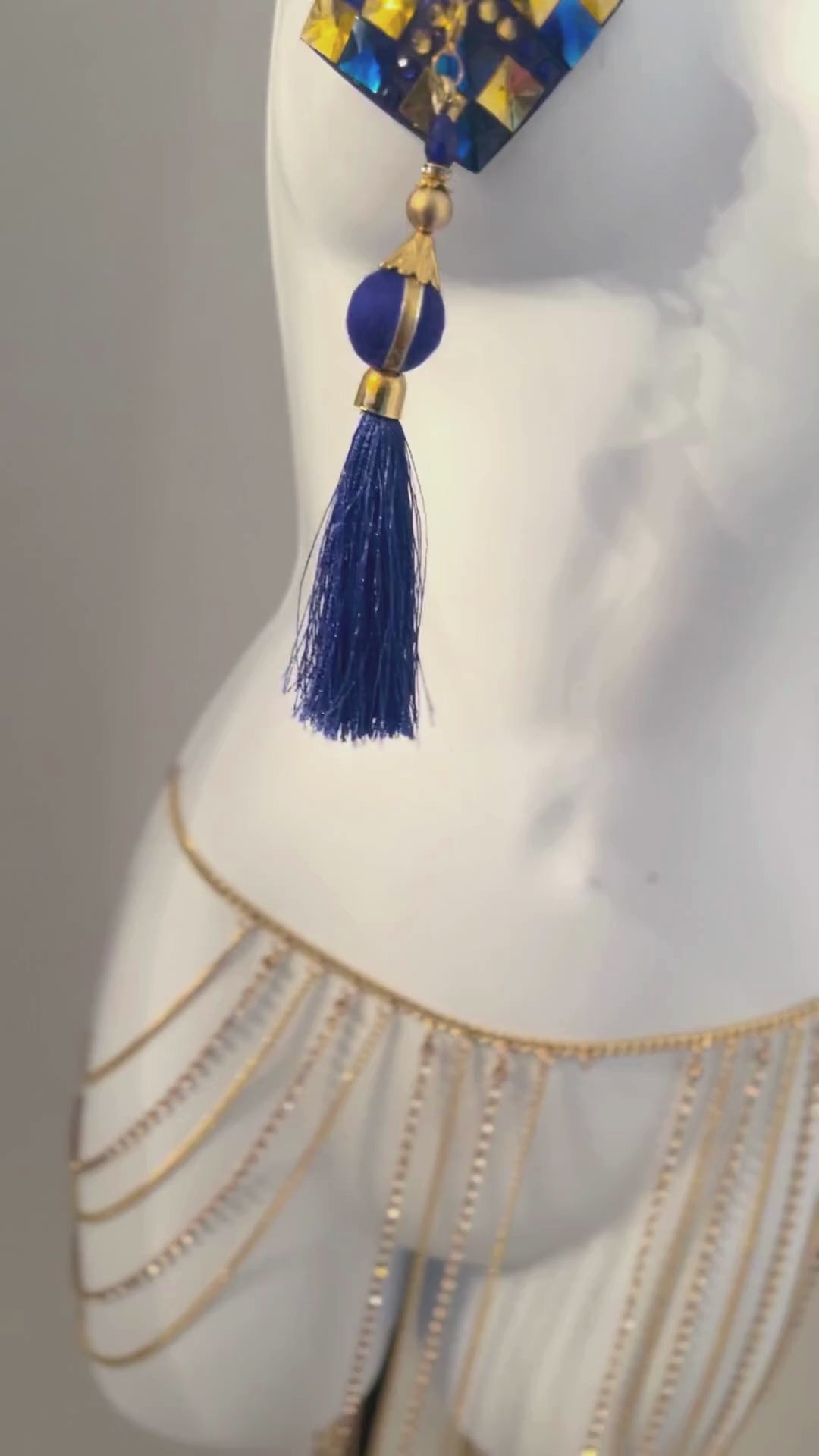ROYAL TEASE Cache-tétons carrés bleus et dorés/diamants, couvertures (2 pièces) avec pompons amovibles (2 pièces) Lingerie burlesque Raves et festivals