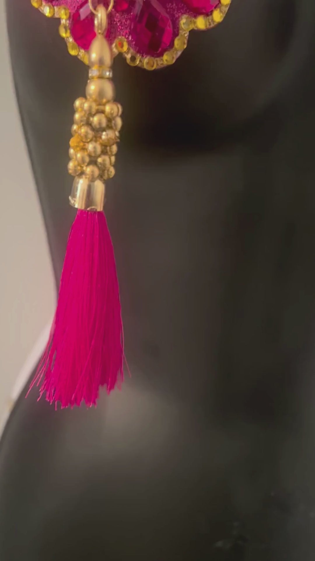 These stunning handmade BLOSSOM pasties are the perfect addition to every landscape. This floral design is bursting with hot pink and gold gems and has a gorgeous pink and golden tassel which is removable (perfect for many different looks!) Do not be fooled by the big bold appearance - these pasties are lightweight and reusable – perfect barely-there-flair for any outfit or attitude. You grow girl!