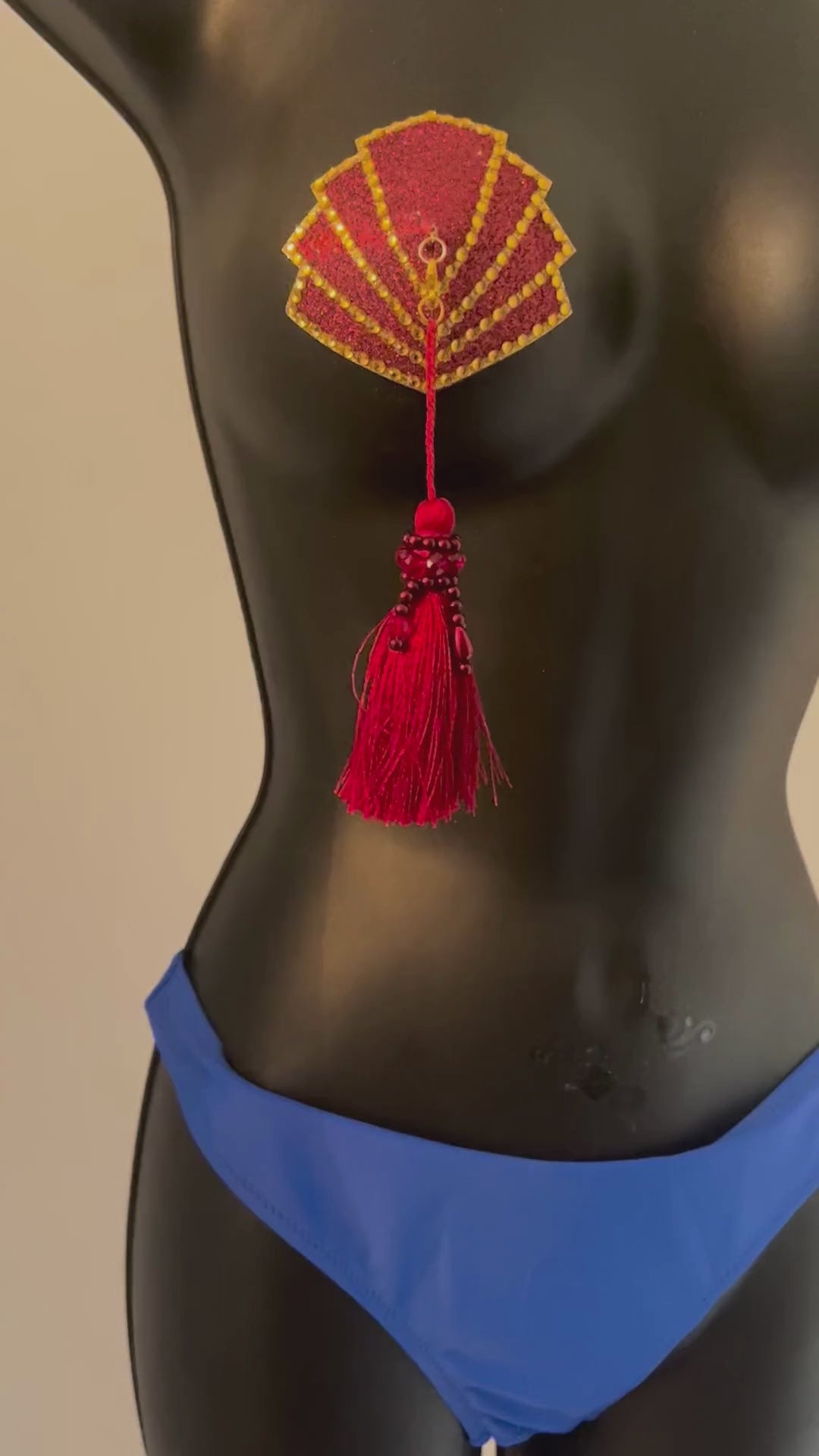 These FANGIRL nipple pasties were inspired by a recent visit to the Moulin Rouge. Deep rich burgundy glitter is highlighted with gold gems evoking a moment of stage splendour in a in a seductive, lush setting. The rich burgundy tassels host a beautiful beaded design that adds bit of extra weight to add a little magic with every movement. The tassels are removable so you can change up your look with every use (yes, these are reusable!). Also, these nipple pasties come made ready to wear - just peel and stick!