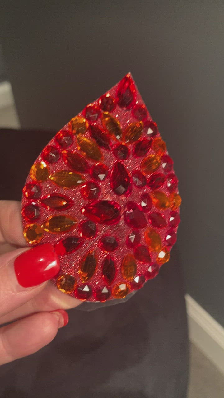 These gems are one spicy statement! These stunning teardrop constructed handmade gems destined to raise the temperature in any room. Channel a glamorous vintage vibe in these gorgeous pasties that house ample red and yellow gems on a red glitter base. ! These pasties are reusable – a perfect accessory for any outfit or attitude. Add a lot of spice as only you can do.