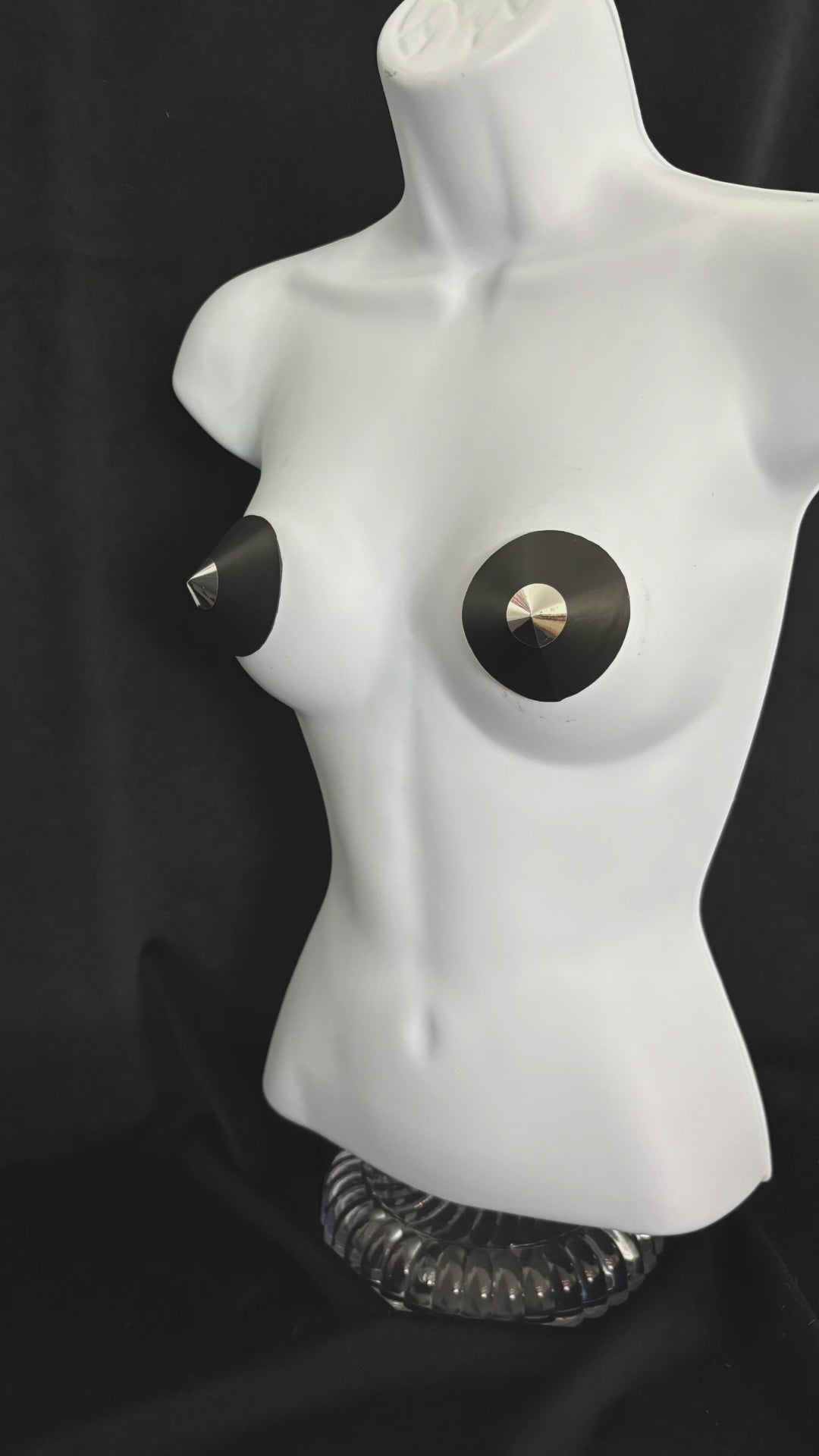 These striking conical pasties are crafted in a smooth faux leather finish and crowned with a bold metallic point, creating a look that’s equal parts modern armor and high-glam statement. The structured cone silhouette sculpts a dramatic profile, while the contrast of matte texture and high-shine metal brings irresistible edge. They channel futuristic showgirl energy with a touch of avant-garde attitude — powerful, polished, and unapologetically bold.