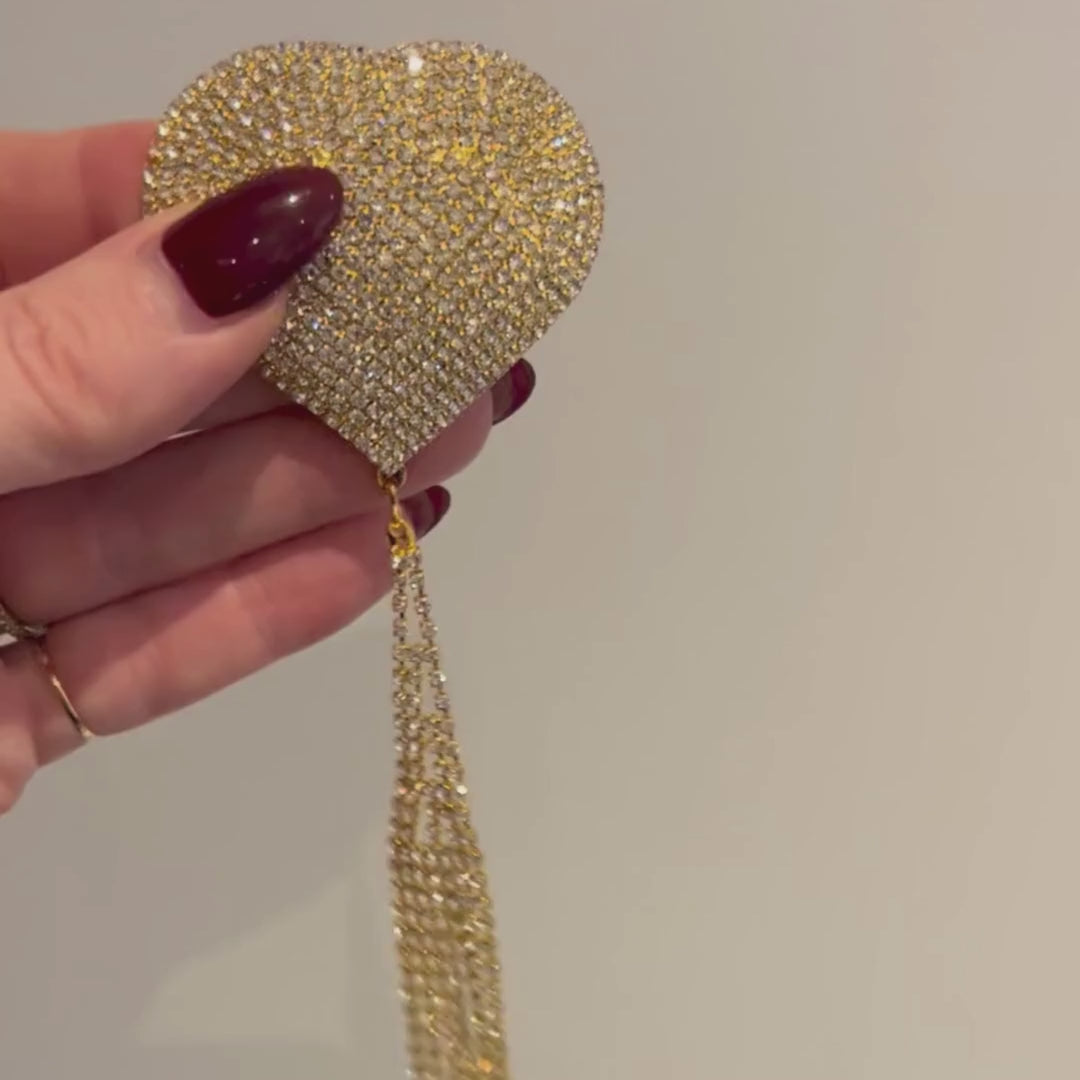 ROXY ROYALE Gold and Rhinestone Heart with Rhinestone Tassels Nipple Pasty, Cover (2pcs) Burlesque Tassel Lingerie Raves and Festivals